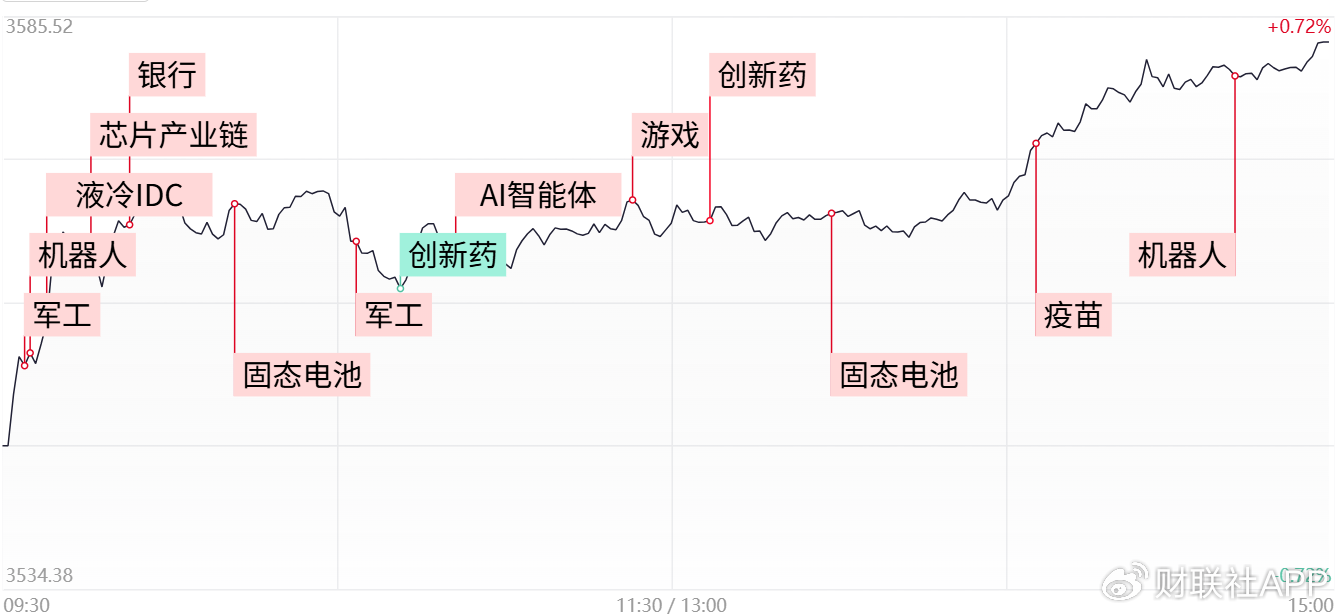 今日市场低开高走,最终三大指数全线收涨,超3800只个股飘红。但需注意的是,今日市场的量能进一步萎缩,并且指数仍处于5日线之下。明日走势较为关键,指数想要重新转强的话,需进一步带量反弹,且重新站稳于5日均线之上,届时沪指方有望再度挑战3640一线的压力区间。反之若遇5日线再度缩量回落,那么短线仍先以震荡整理结构看待。而从盘面上来看,目前延续良性轮动态势,一方面,军工、固态电池等前期调整过程的热点方向,受消息面的催化后再度走强,另一方面,创新药、AI应用等近期热门板块虽一度走低,但在盘中依旧能够获得资金强而有力的承接,可见市场整体维持着较高活跃度,因此只要相关热门板块中期趋势没有遭到破坏,仍可短线分歧整理的过程中寻找一些核心个股的低吸机会。